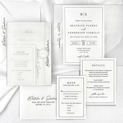 Sold out - Minimalist White Wedding Invitation, Classic Neutral Wedding Invitation with Translucent Vellum Jacket, Personalized Belly Band and Pearl Wax Seal