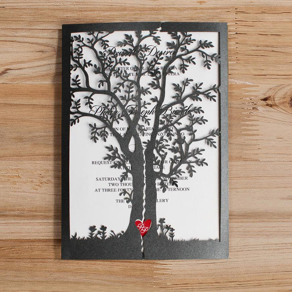 Black Tree Invitations, Red Heart Wedding Invite Cards