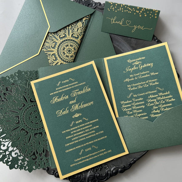 4, Included: Wedding Invitation Pockets + Gold Foil Invitation Cards + Gold Foil Details or RSVP Cards + Envelopes