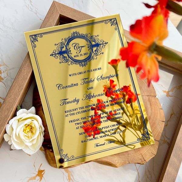 1, Item: Gold and Navy Mirror Wedding Invitation