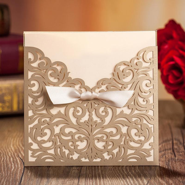 Golden Gate-fold Wedding Invitations; Gold Lace Wedding Invitation Cards - Set of 50pcs