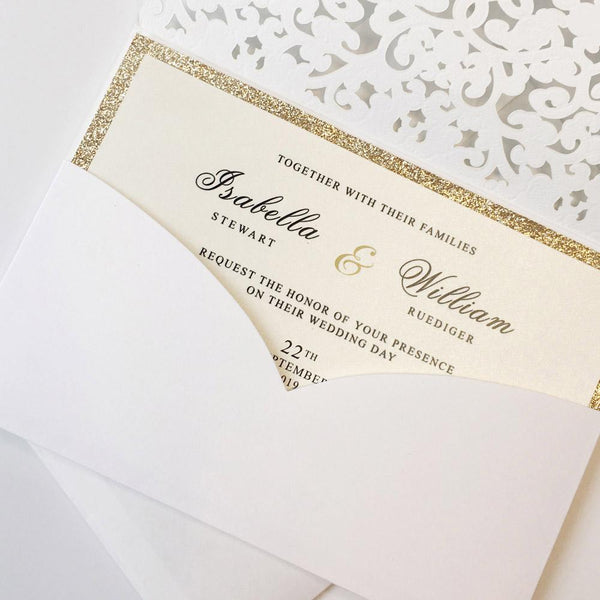 4, Included: White Laser Cut Pockets + 2-Layers Gold Glitter Invitation Cards + White Envelopes + Seals