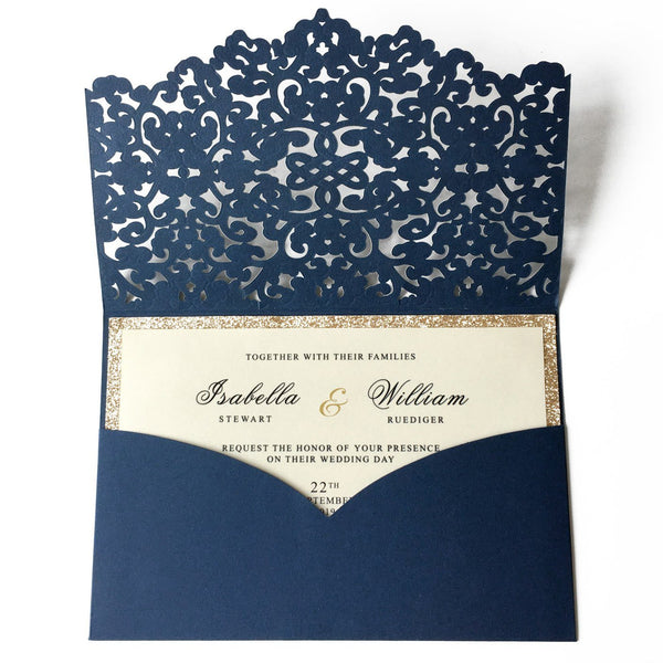 5, Included: Navy Laser Cut Pockets + 2-Layers Gold Glitter Invitation Cards+Navy Envelopes + Seals