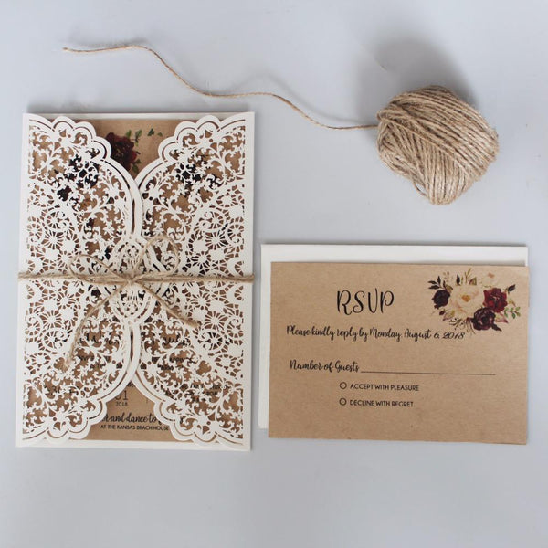 Included: Laser Cut Invitation Wraps + Kraft Paper Invite Cards + RSVP + Envelopes + Seal + Hemp rope