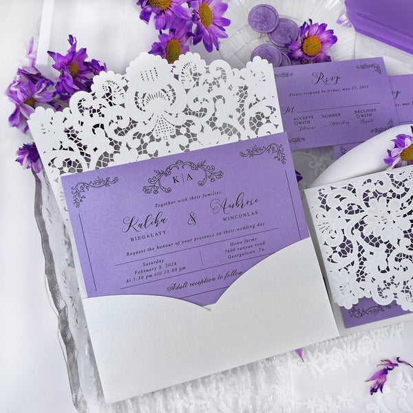 3, Package Include: Lace Laser Cut Pockets + Purple Invite Cards + RSVP Cards + Envelopes + Seals.