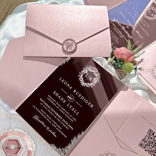 3, Package Include: Blush Pink Pockets + Rose Gold Acrylic Cards + Blush Pink RSVP Cards + Handmade Wax Seals + Envelopes