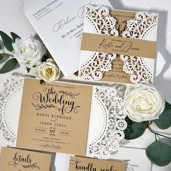 Rustic Kraft Wedding Invitation Suite, Neutral Tan Lace Invite Card